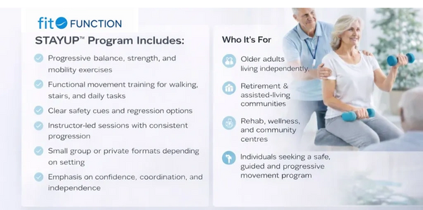 STAYUP™ applies these proven principles through a 4 week program that includes guided instruction, clear progressions, individual assessments and safe, functional, movement patterns that translate directly to real-world activities like walking, stairs, and transfers.